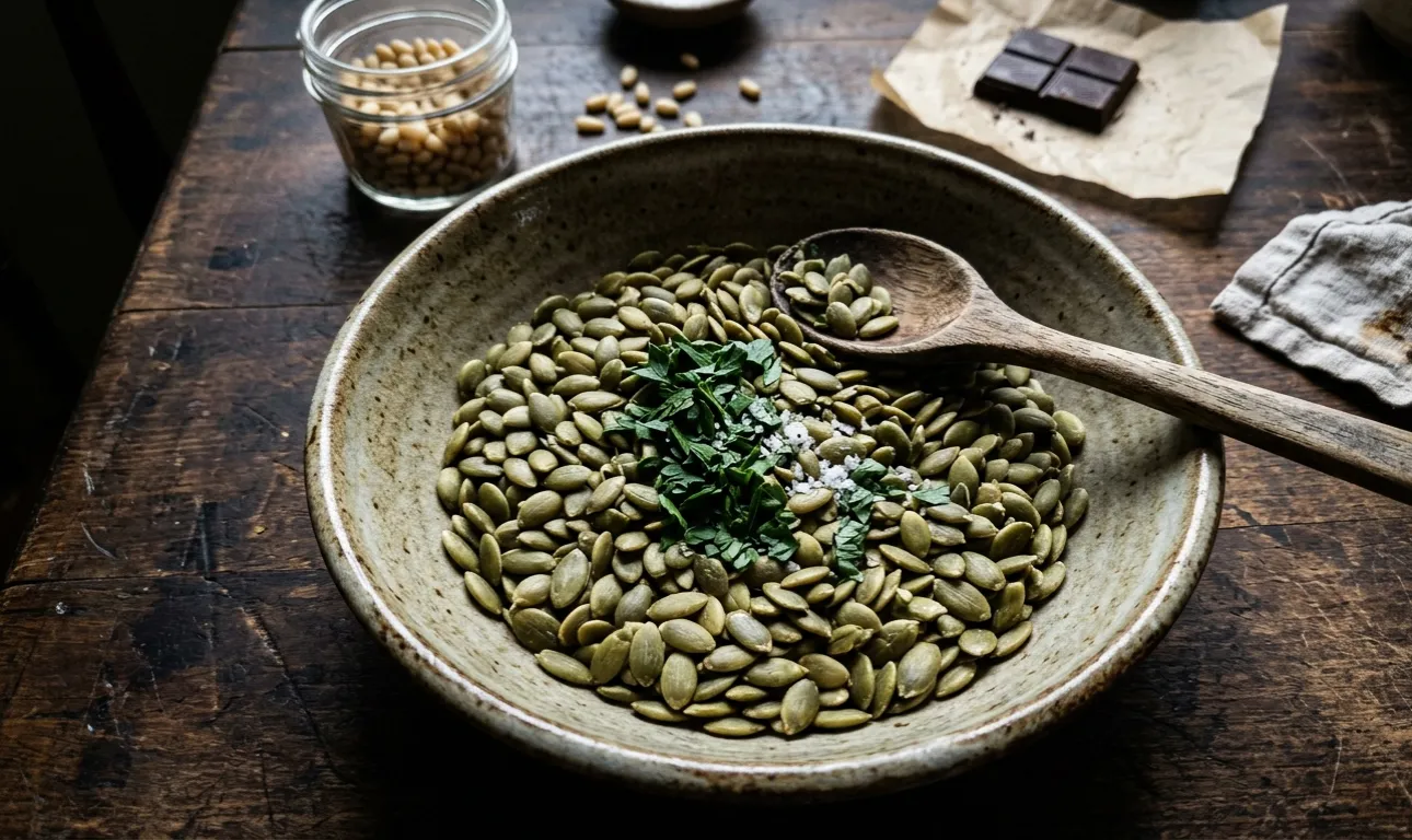 Ant rytinės košės užbarsčiau saują žalių moliūgų sėklų.