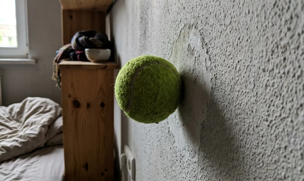 Teniso kamuoliuko naudojimas prie sienos giliam probleminės srities savaiminiam masažui.